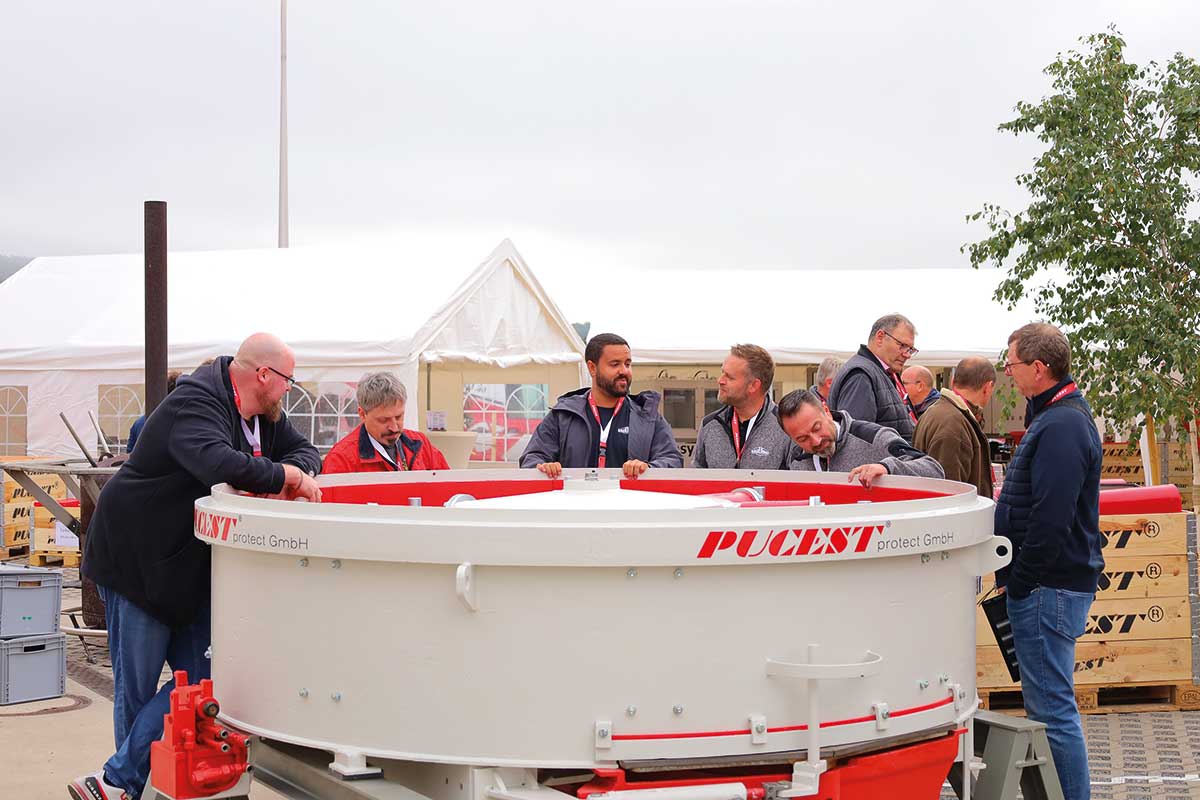 Ein echtes Highlight bildete der optimierte Ringtrogmischer, ausgestattet mit dem vielseitigen Universalmischarm von PUCEST. Dieser bot den Gästen nicht nur einen realitätsnahen Einblick in den optimalen Verschleißschutz, sondern entwickelte sich auch zum zentralen Treffpunkt für Fachgespräche.